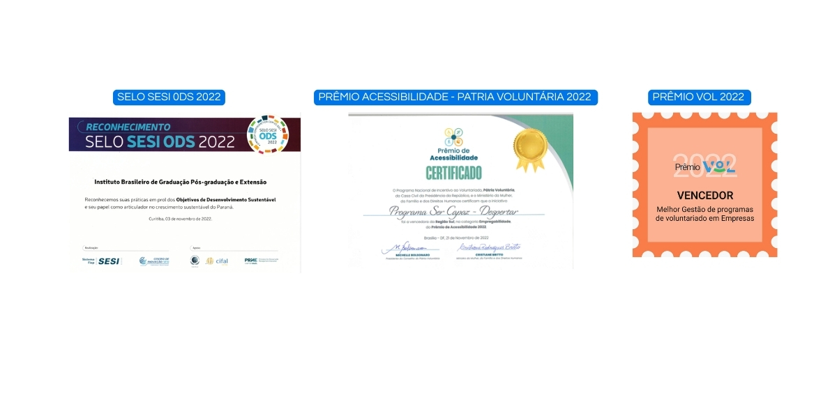 Cada reconhecimento que conquistamos carrega a força de uma história construída com autenticidade e propósito. Nossos selos, prêmios e certificações vão muito além de resultados: são provas vivas de que nossas ações alcançam pessoas, transformam trajetórias e reafirmam, todos os dias, o compromisso de promover um mundo mais justo, inclusivo e sustentável. Cada selo recebido é um lembrete de que seguimos na direção certa — e de que a verdadeira transformação acontece quando o conhecimento se une ao cuidado genuíno com as pessoas.