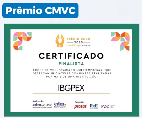 O Prêmio CMVC – Conexões que inspiram tem como objetivo reconhecer e valorizar as melhores práticas de voluntariado corporativo no Brasil. O IBGPEX ficou em 5º lugar na categoria Multiempresa pela Ação Humanitária Rio Grande do Sul, realizada em 2024, em parceria com a Unidas, COPEL Energia e Votorantim Cimentos.