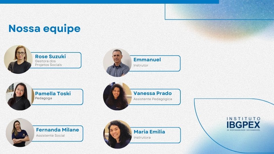 O IBGPEX é formado por uma equipe multidisciplinar, comprometida com a promoção de ações sociais e com o desenvolvimento de competências técnicas e comportamentais dos participantes de seus programas e projetos. Essa atuação integrada visa contribuir de forma efetiva para a formação cidadã e profissional dos beneficiários.